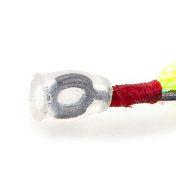 Durch dem durchsichtigen Silikonschlauch über dem großen Öhr kann dieser leicht auf dem Haupthaken montiert und fixiert werden. Durch diesen zusätzlich zu montierenden Haken kann die Verwertung der Bisse der Finesse Montagen deutlich verbessert werden. Zusätzlich bietet dieser Trailer Hook Range mit dem Flash Fiber Skirt einen interessanten, pulsierenden Reiz.