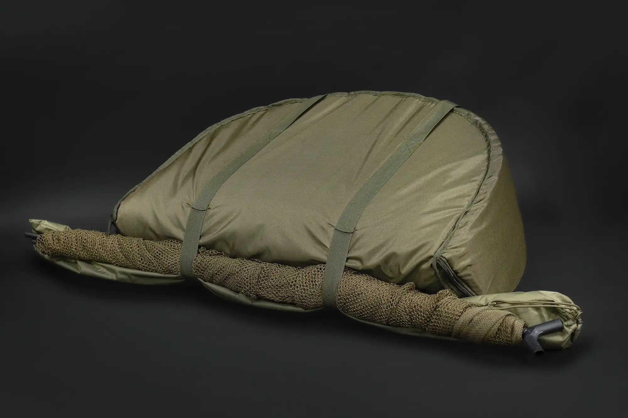 Wenn die Basix Carp Cradle nicht in Gebrauch ist, lässt sie sich in zwei Teile falten und bietet Platz für ein Carp Care Kit und eine Basix Weigh Sling.